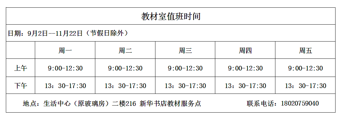 二、地点:生活中心(原玻璃房)二楼216 新华书店教材服务点;